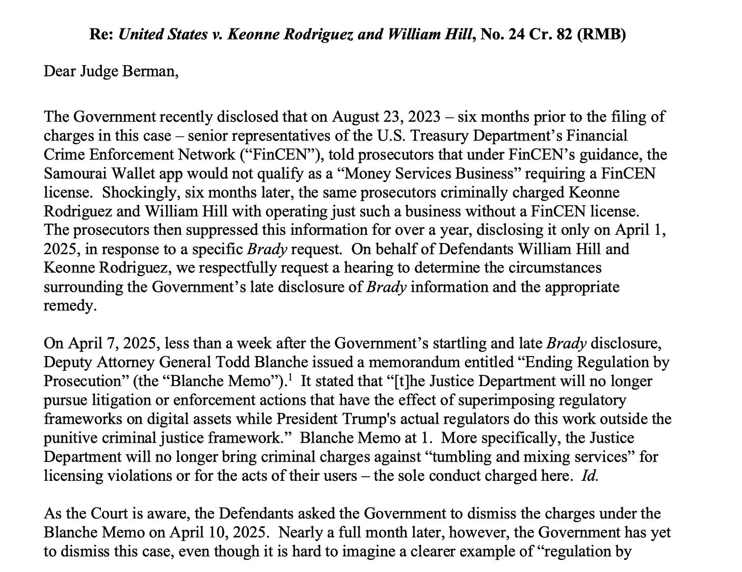 Despite this FinCEN noted, the DOJ brought charges against Rodriguez and Hill, alleging that Samourai Wallet was in fact operating as an unlicensed money transmitter. The defense argues that this exculpatory information was withheld for over a year, only being disclosed on April 1, 2025, in response to a specific Brady request, which obliges the government to disclose evidence favorable to the defense.