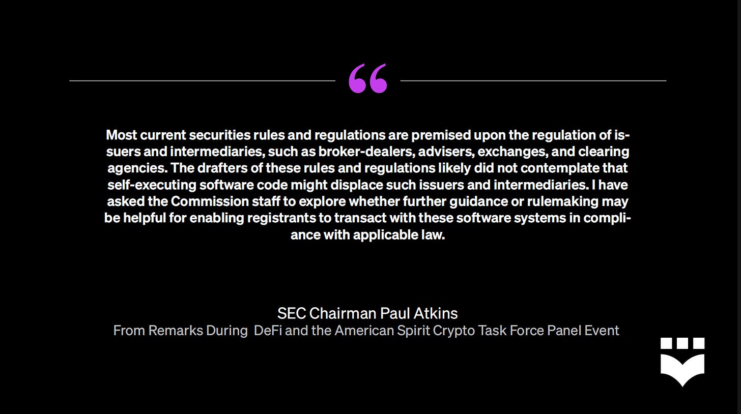 Atkins signaled support for a conditional “innovation exemption” for developers creating DeFi protocols. The Chairman shared that he was exploring options and had instructed his staff to look into how the Commission's rules could be amended to provide such an exemption, which would, in theory, allow developers to bring decentralized technologies to market with less fear of being subject to regulation better suited for centralized financial intermediaries.