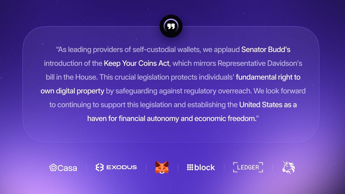 On July 15, 2025, U.S. Senator Ted Budd (R-NC) was joined by Senator Mike Lee (R-UT) in reintroducing the Keep Your Coins Act (KYCA). Senator Budd previously introduced the Keep Your Coins Act in the Senate in 2023. The purpose of the act is to prevent the federal government from restricting or infringing an individual's right to self-custody their own assets.