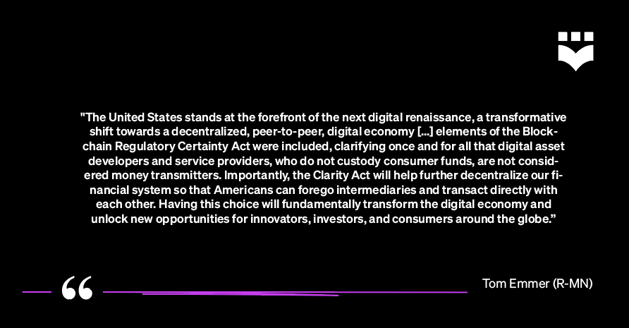 Importantly, the bill managers, HFSC Chairman French Hill (R-AR), House Agriculture Committee Chairman GT Thompson (R-PA), and GOP Majority Whip Tom Emmer (R-MN) delivered key speeches on the House floor expressing the congressional intent related to how the CLARITY Act treats DeFi.